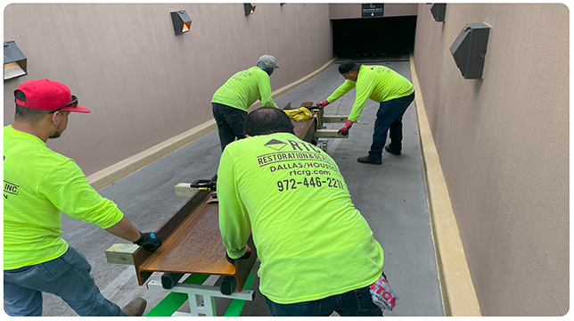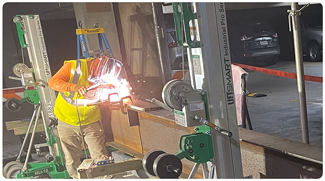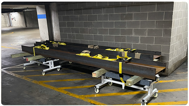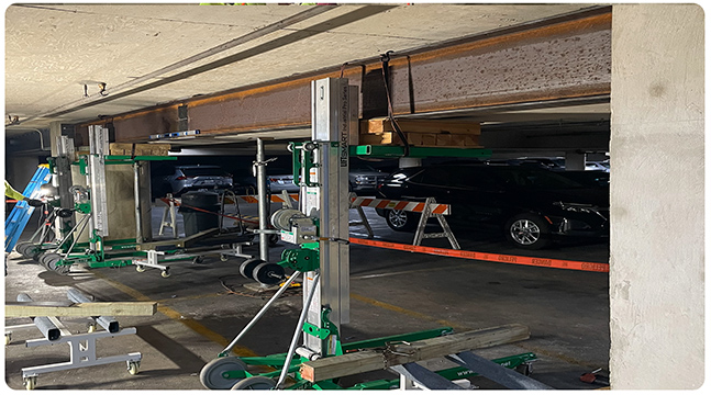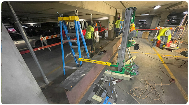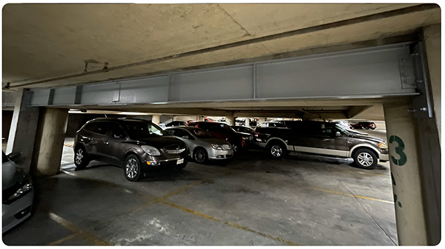 The existing parking structure consists of a 2-phase cast-in-place underground concrete structure separated by an expansion joint at all levels. In the original phase of construction, the concrete that spans the center columns at the expansion joint of P2 and P3 sags due to insufficient support which was previously corrected with steel beam installation (during Phase 2 construction of the other garage) at the outer drives of both P2 and P3. The existing conditions were reviewed and a phased repair design (P3 is Phase 1) was issued by a structural engineer. The span of the sagging area requiring additional support measures approximately twenty-eight (28) linear feet at each level. The design called for installation of structural steel beam and associated components attached to the columns in order to support the span of the sagging concrete. On-site conditions would not allow for a 28 LF steel beam to travel from the ground level to the lower level in single piece. The engineered design took this into account and the beam was transported into the structure in 2 pieces and assembled at the bottom of the garage structure prior to installation.